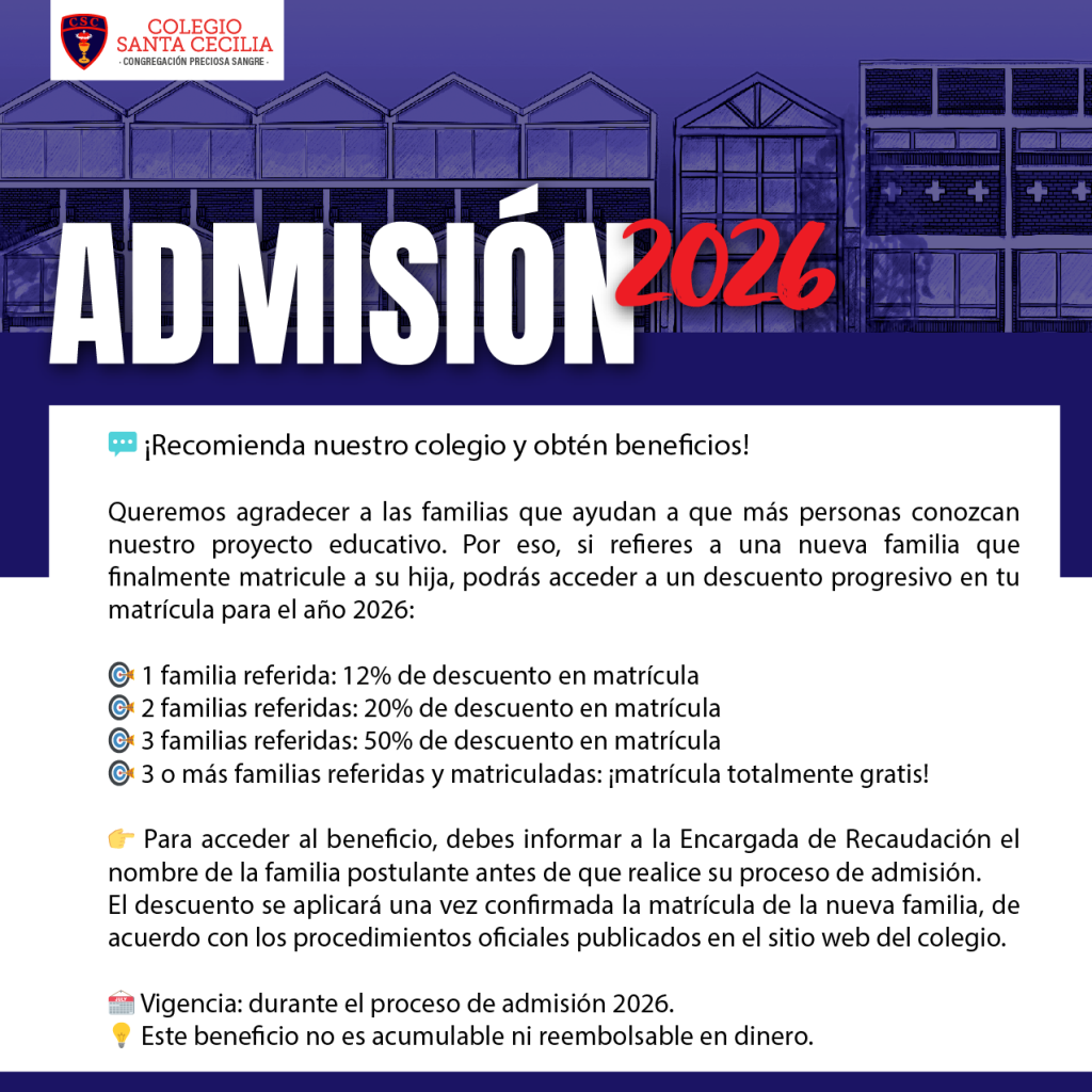 Tal como se informó en la circular de Matrícula 2026 enviada a las familias el 29 de septiembre, a partir de este año está disponible un beneficio econónico por referidos para el proceso de admisión 2026.