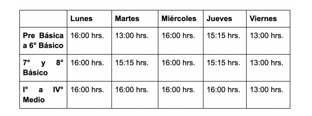 La jornada escolar completa inicia el lunes 16 de marzo a las 08:00 Hrs., siendo éste el horario regular de ingreso que rige durante todo el año escolar. Los horarios de salida son diferenciados por nivel de acuerdo a la siguiente organización: